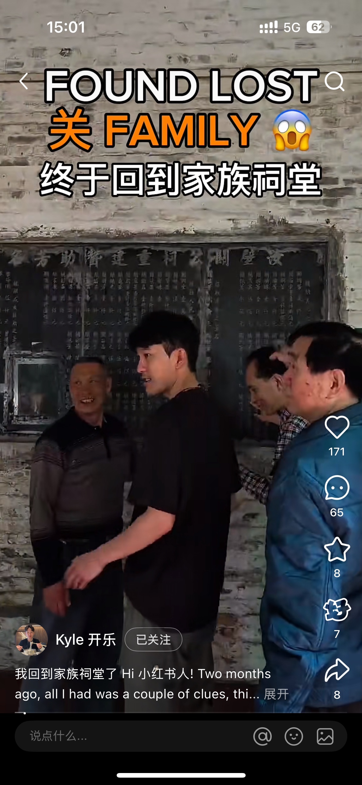 此刻,这段跨越时空的历史仿佛形成了一个完美的闭环,微妙而震撼。“想到两个月前,我几乎不会说中文,现在却能向这些关氏后裔表达我的一些想法与感受,我不禁露出了笑容。”3月29日,开乐在小红书更新了寻亲视频,并留下了这段感言。视频下方,一路追随开乐寻亲之旅的网友们纷纷留言:“恭喜你回家了!”