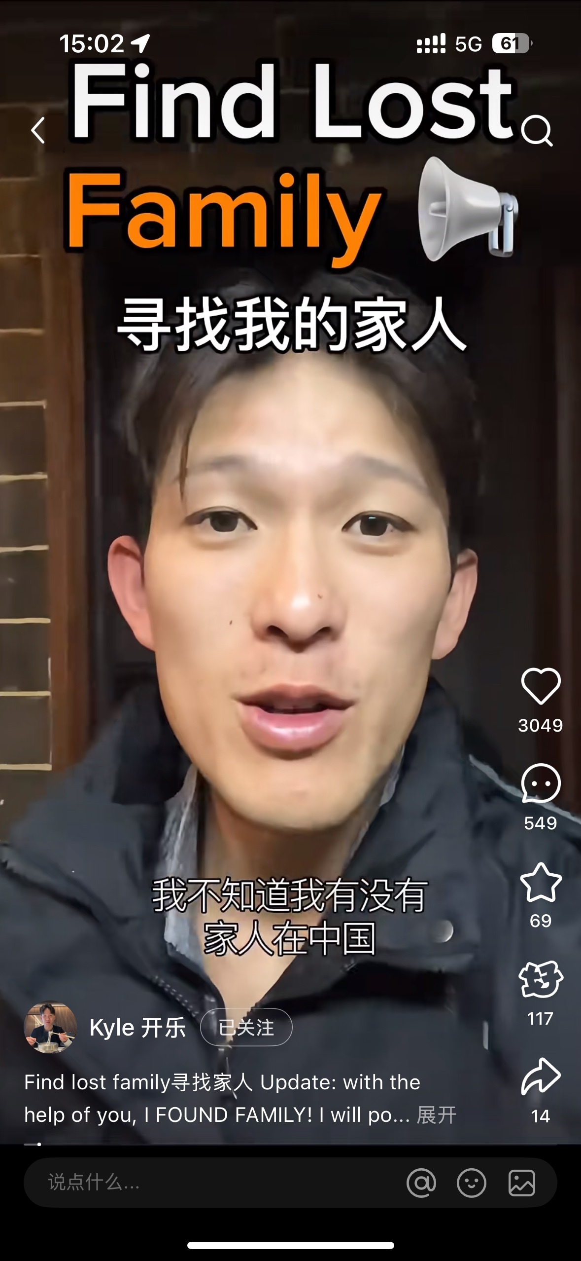 开乐在小红书上发布的第一条寻亲视频。来源:Kyle开乐小红书
