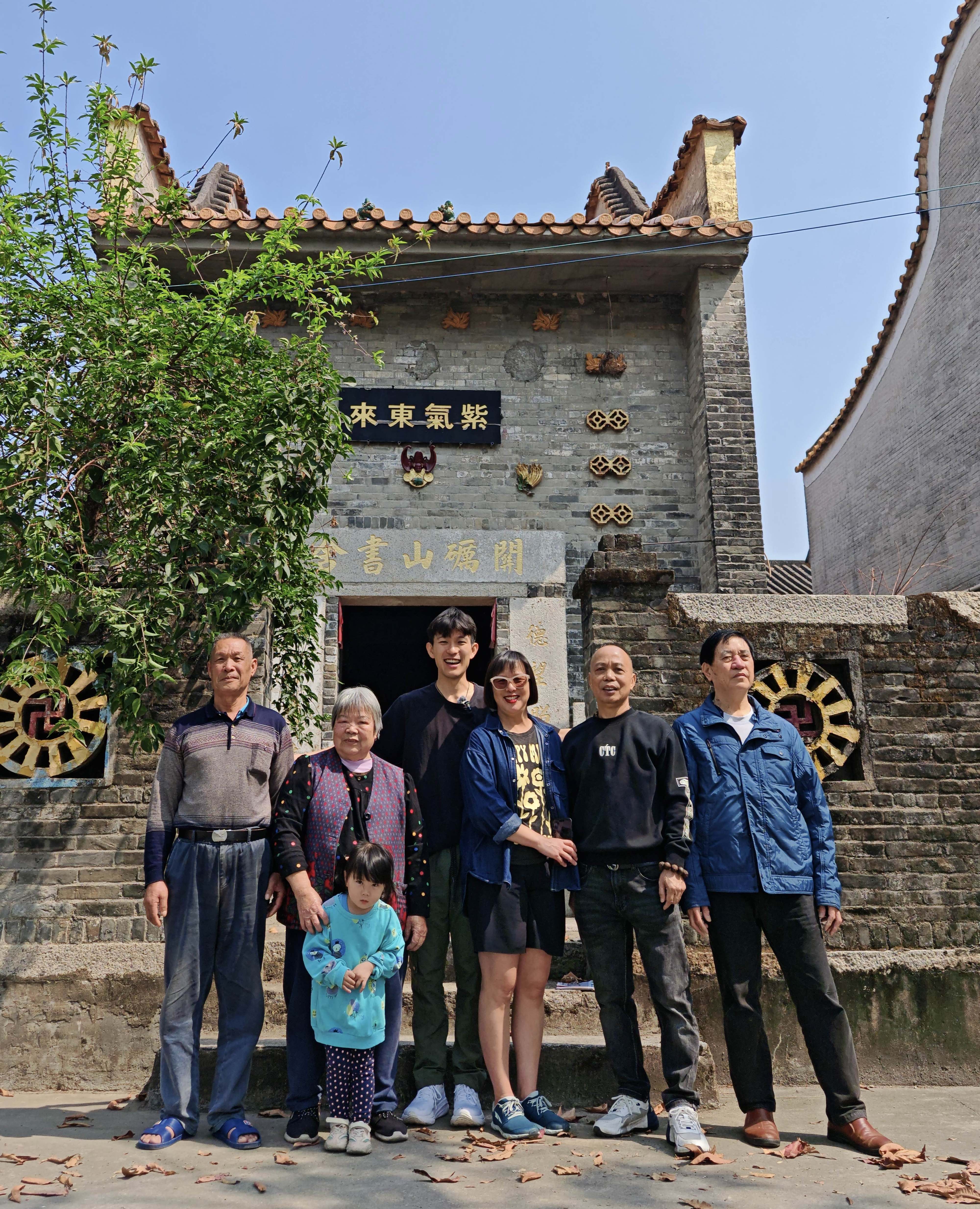 开乐(右四)和母亲(右三)在家祠前与亲人们合照。受访者供图